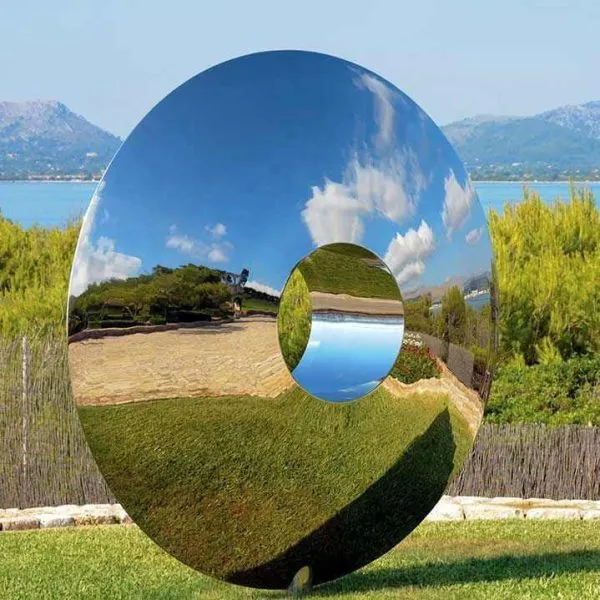 Grande scultura moderna in acciaio inossidabile con cerchio lucidato a specchio